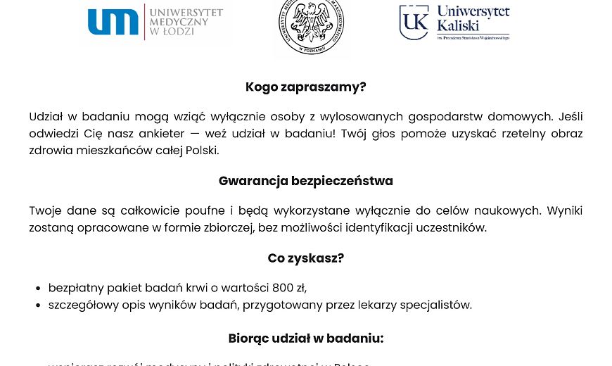 Badania terenowe prowadzić będą współpracownicy renomowanych agencji badawczych Research Collective oraz Kantar, natomiast analizy laboratoryjne wykona firma Diagnostyka. Wizyta ankietera w wybranych gospodarstwach domowych umożliwia udział w bezpłatnym badaniu.