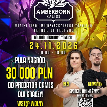 30 października 2025Miasto Kalisz wraz z partnerami i współorganizatorami zaprasza wszystkich fanów gier komputerowych oraz e-sportu na wielki finał międzyszkol...nego turnieju League of Legends – Amberborn Kalisz Szkolny Turniej E sportowy. Wydarzenie odbędzie się 24 listopada 2025 roku w godzinach 10:00–18:00 w Galerii Handlowej „Amber”. -