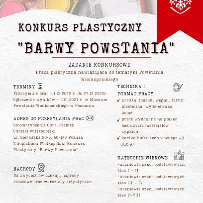 09 grudnia 2022Stowarzyszenie Odra-Niemen Oddział Wielkopolski w Poznaniu organizuje konkurs plastyczny "Barwy Powstania". Konkurs skierowany jest do uczni...ów szkół podstawowych województwa wielkopolskiego. -