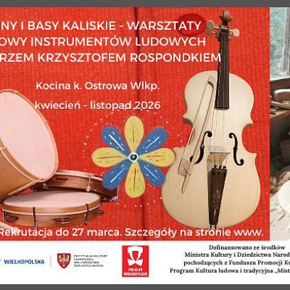 16 marca 2026Centrum Kultury i Sztuki w Kaliszu organizuje ośmiomiesięczne warsztaty budowy instrumentów ludowych: bębnów i basów kaliskich. Warsztaty po...prowadzi Mistrz Tradycji Krzysztof Rospondek, jedyny w regionie specjalista z tej dziedziny, który swoje rzemiosło wykonuje od 20 lat. Zajęcia będą odbywały się w Kocinie (gmina Sośnie w powiecie ostrowskim) cztery razy w miesiącu - od kwietnia do listopada 2026. -