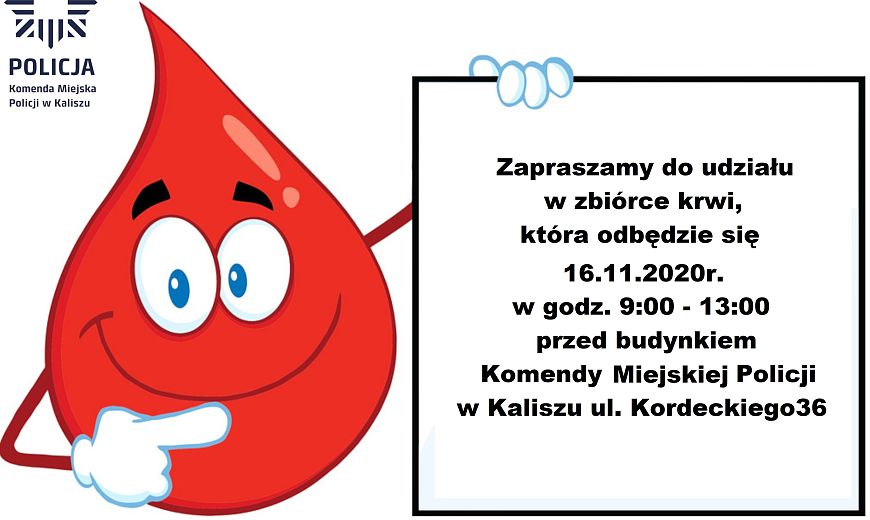 Autobus z Regionalnego Centrum Krwiodawstwa i Krwiolecznictwa w Kaliszu będzie oczekiwał na parkinu przed budynkiem Komendy Miejskiej Policji w Kaliszu (ul. Kordeckiego 36).