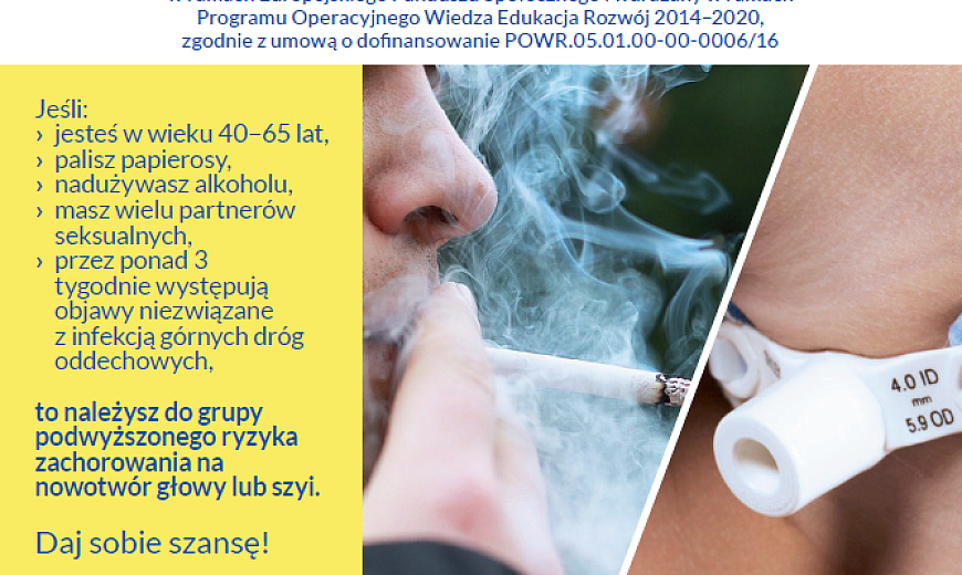 W bezpłatnych badaniach mogą wziąć udział osoby z przedziału wiekowego 40-65 lat, w szczególności te, o których przez ponad 3 tygodnie występowały, niezwiązane z infekcją górnych dróg oddechowych, następujące objawy: pieczenie języka, niegojące się owrzodzenie oraz/lub czerwone albo białe naloty w jamie ustnej, ból gardła, przewlekła chrypka, guz na szyi, niedrożność nosa, krwawy wyciek z nosa, ból w trakcie połykania oraz/lub problemy z połykaniem.
