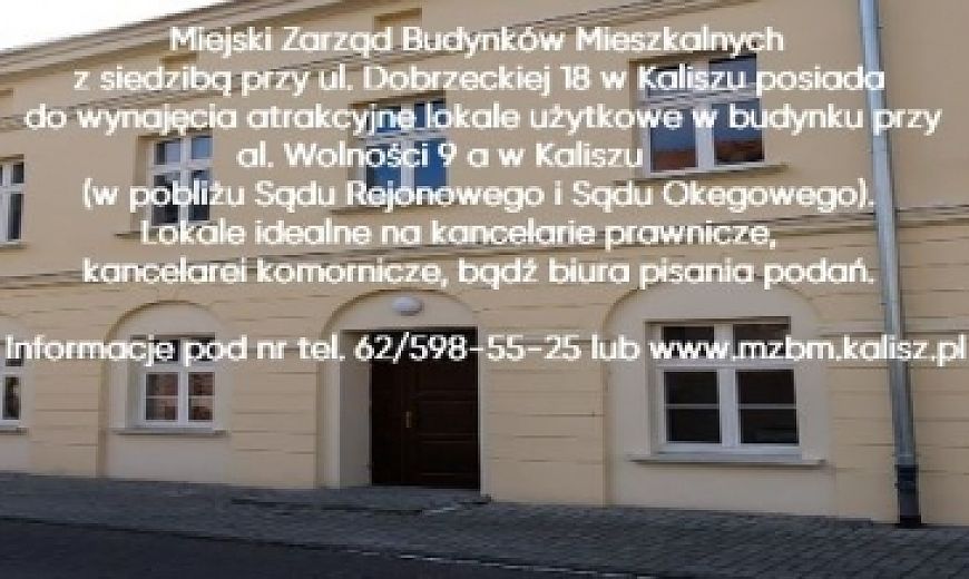 Miejski Zarząd Budynków Mieszkalnych z siedzibą przy ul. Dobrzeckiej 18 w Kaliszu posiada do wynajęcia atrakcyjne lokale użytkowe w budynku przy al. Wolności 9 a (w pobliżu Sądu Rejonowego i Sądu Okręgowego).