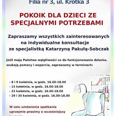 02 kwietnia 2019Filia nr 3 Miejskiej Biblioteki Publicznej im. Adama Asnyka zaprasza wszystkich rodziców na indywidualne konsultacje związane z funkcjonowan...iem i rozwojem dziecka. Przeprowadzi je Katarzyna Pakuła-Sobczak. -