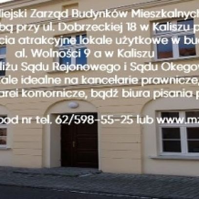 10 maja 2018Miejski Zarząd Budynków Mieszkalnych z siedzibą przy ul. Dobrzeckiej 18 w Kaliszu posiada do wynajęcia atrakcyjne lokale użytkowe w budynku...przy al. Wolności 9 a (w pobliżu Sądu Rejonowego i Sądu Okręgowego). -