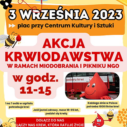 30 sierpnia 2023W najbliższą niedzielę 3 września na placu przy Centrum Kultury i Sztuki odbędzie się akcja krwiodawstwa, organizowana w ramach kaliskiego M...iodobrania i Pikniku NGO. Zapraszamy w godzinach 11:00-15:00.