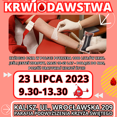 17 lipca 2023W najbliższą niedzielę 23 lipca w godzinach 9.30-13.30 będzie można oddać krew przy Parafii Podwyższenia Krzyża Świętego w Kaliszu, ul. Wroc...ławska 209 -