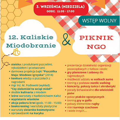 29 sierpnia 2023W niedzielę 3 września w Parku Miejskim odbędzie się Piknik Organizacji Pozarządowych. Wydarzeniem towarzyszącym będzie XII Kaliskie Miodobr...anie. -