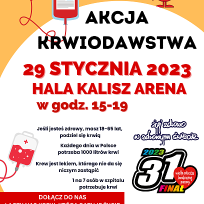 19 stycznia 202329 stycznia podczas 31 . finału WOŚP odbędzie się akcja poboru krwi. Ambulans stanie przy hali Arena Kalisz w godz. 15.00 - 19.00. -