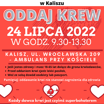 20 lipca 2022W najbliższą niedzielę 24 lipca w godzinach 9.30-13.30 będzie można oddać krew przy Parafii Podwyższenia Krzyża Świętego w Kaliszu, ul. Wroc...ławska 209 -