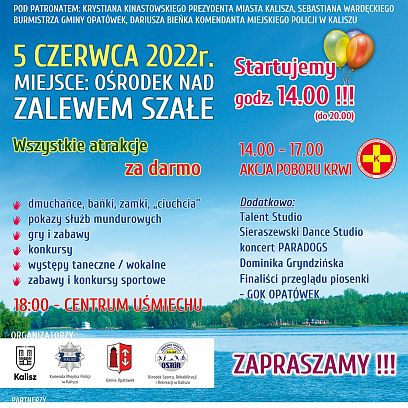 27 maja 2022Krystian Kinastowski, Prezydent Miasta Kalisza, Komenda Miejska Policji w Kaliszu, Miasto i Gmina Opatówek oraz Ośrodek Sportu, Rehabilitacj...i i Rekreacji w Kaliszu zapraszają 5 czerwca na Dzień Dziecka, który odbędzie się nad zalewem Pokrzywnickim w godzinach od 14.00 do 20.00.