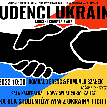 25 kwietnia 2022Wydział Pedagogiczno-Artystyczny w Kaliszu Uniwersytetu im. Adama Mickiewicza w Kaliszu organizuje koncert charytatywny z cyklu "Studenci Uk...rainie", który odbędzie się w czwartek, 28 kwietnia o godzinie 18:00 w sali kameralnej przy ul. Nowy Świat 28-30. -