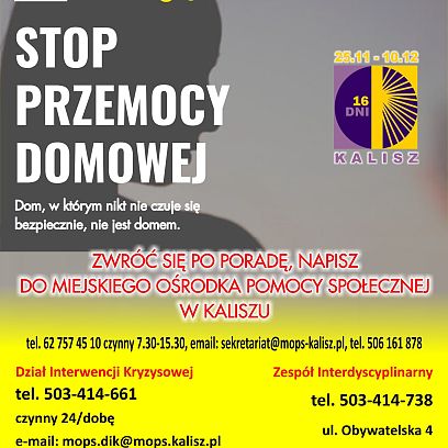 25 listopada 2021Rozpoczęła się akcja „16 dni przeciw przemocy ze względu na płeć”, do której przyłączył się Miejski Ośrodek Pomocy Społecznej w Kaliszu. W t...ym roku kaliska placówka włącza się także w działania w ramach przedsięwzięcia „Make love not przemoc”.