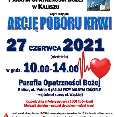 24 czerwca 2021Polski Czerwony Krzyż Rejonowa Rada Honorowego Krwiodawstwa w Kaliszu oraz Parafia Opatrzności Bożej w Kaliszu zapraszają na akcję poboru kr...wi, która odbędzie się w najbliższą niedzielę, 27 czerwca. -