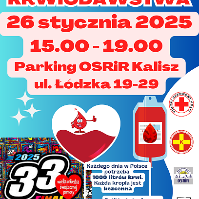 20 stycznia 202526 stycznia podczas 33. finału WOŚP odbędzie się akcja poboru krwi. Ambulans stanie przy hali widowiskowo-sportowej OSRiR w godz. 15:00-19:0...0. -