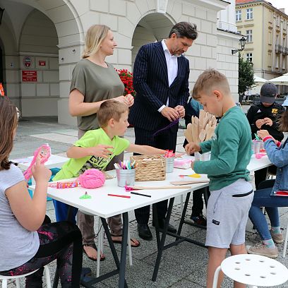 09 lipca 2020Właśnie trwają pierwsze warsztaty w ramach Dziecięcych Czwartków przed ratuszem. Kreatywność dzieci podziwiał dziś prezydent Krystian Kinast...owski. -