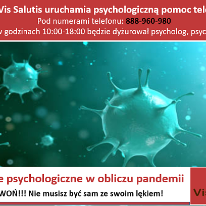 23 marca 2020Fundacja Vis Salutis uruchomiła psychologiczną pomoc telefoniczną. Wstępnie inicjatywa planowana jest do 13 kwietnia 2020 r. W zależności od...rozwoju wypadków termin ten może zostać wydłużony. -