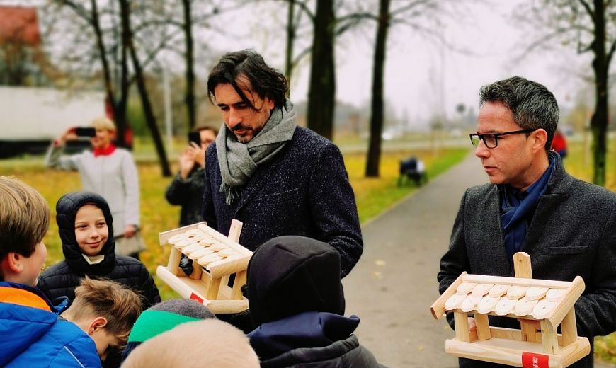 Wiceprezydenci Kalisza przekazali uczniom osiemnastki prezenty - karmniki dla ptaków oraz miejskie gadżety promujace ekologiczny tryb zycia.